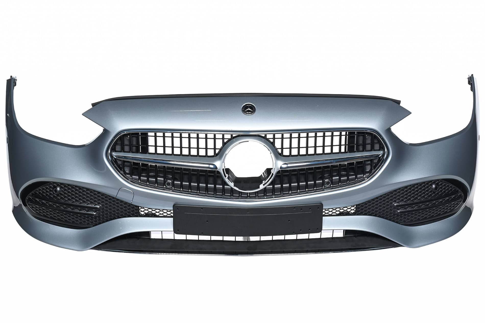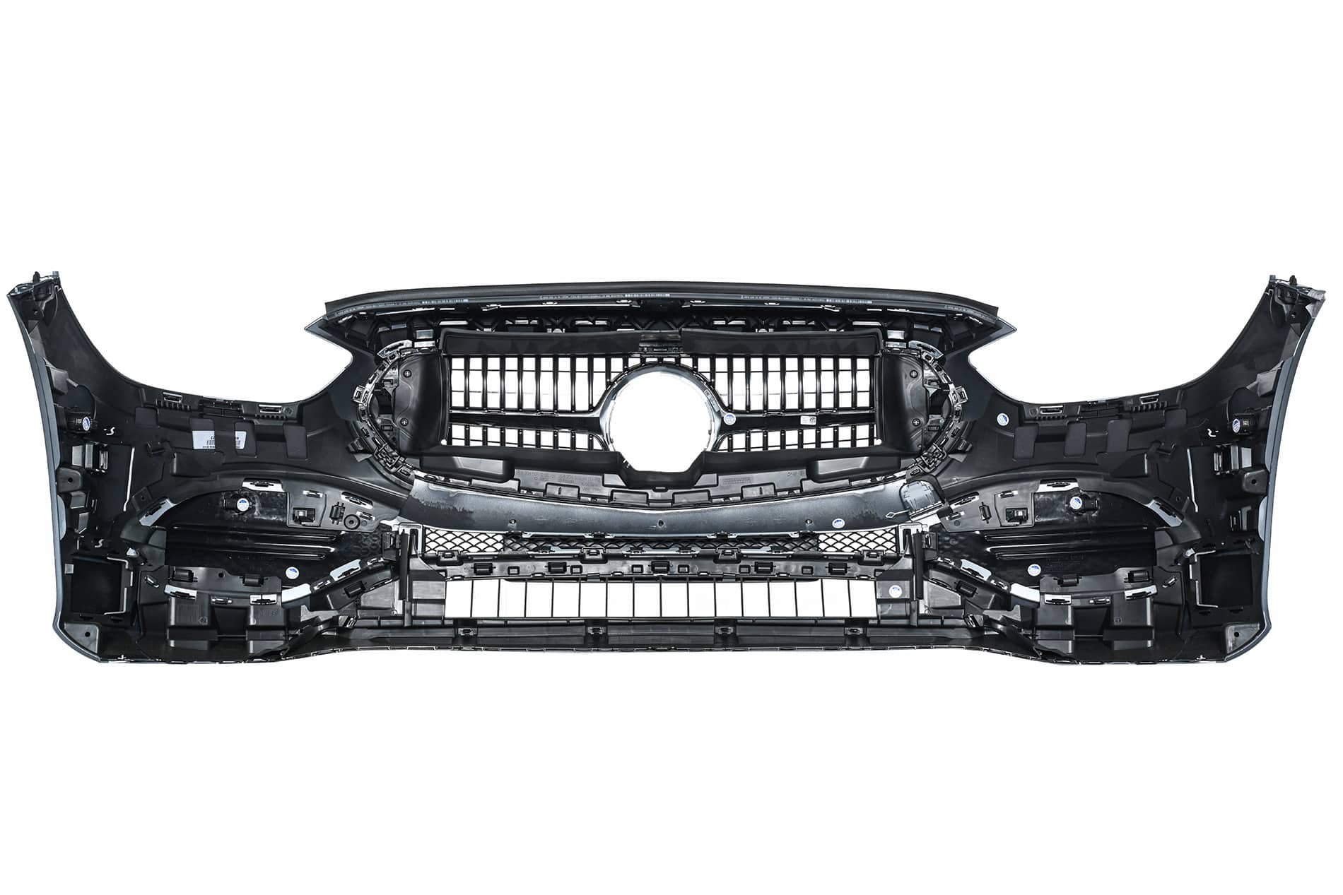 Oryginalna część Mercedes-Benz, . Zderzak posiada otwory na tablicę rejestracyjną zgodne z normą ECE. Mogą być obecne dodatkowe otwory pod inne warianty – po montażu zakrywane ramką tablicy. Pasuje zarówno do wersji z/bez radaru.